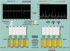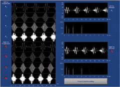 The ASSR is typically recorded with a vertical or diagonal electrode montage, similar to those used in ABR. An advantage of a single-channel vertical montage is that it can be used to test both ears individually, without moving any electrode location. The filters used to record the ASSR are lower than those used for the ABR, because the ASSR spectral energy of interest is at the eight modulating frequencies of the four carrier tones to each ear, roughly between 80-100 Hz. Whereas the ABR waveform is measured in microvolts (ie, millionths of a volt), the ASSR waveform is so tiny that it is measured in nanovolts (ie, billionths of a volt). As such, one would be hard-pressed to see the ASSR waveform. The ASSR is thus visualized by other means, such as vectors in polar plots (as with the Audera ASSR system produced by GSI), or a concentrated analysis on frequencies of interest (as with the Vivosonic VivoScan), or else in the frequency domain as a Fast Fourier Transform (FFT), where vertical amplitude is seen as a function of frequency (as with the Navigator-Pro system produced by Bio-logic, the system used in this article as an example). The FFTs display the amplitude of the modulating frequencies relative to those of adjacent frequencies (Figure 1).