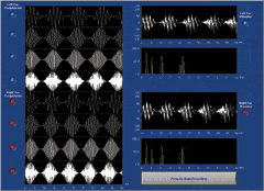 The spectrum (FFT) on the top right of Figure 1 shows the ASSR of interest. Eight yellow bars rise above the eight individual modulation frequencies of the eight carrier frequencies (four for each ear). On the bottom of the figure are eight green circles. Each circle represents whether measured neural activity is actually following the modulations in the stimulus envelope (ie, a true ASSR); if so, it is assumed that the carrier tones must also be audible. The color green indicates an F value of less than 0.05. In Figure 1, all eight circles are green; this means there is a statistical probability of more than 95% that a significant difference exists between the amplitude of the modulating frequency (below the circle) and those of adjacent frequencies in the FFT. If the color of a circle is yellow, this is a caution: there only may be an ASSR present. That is, the F value is between 0.1 and 0.5, meaning there is a statistical probability between 90-95% that an ASSR is truly present. If the color is red, the F value is greater than 0.1, meaning there is less than a 90% chance that an ASSR is truly present.