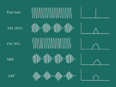 Modulation and Spectral Splatter. Whenever pure-tones are modulated by AM or FM, some additional frequencies are introduced along with the pure-tone frequency of the carrier tone (Figure 3). This is known as spectral splatter which can show up as additional frequencies on either side of the carrier-tone frequency. Frequency specificity of the pure-tone carrier frequencies is thus compromised due to the modulations.