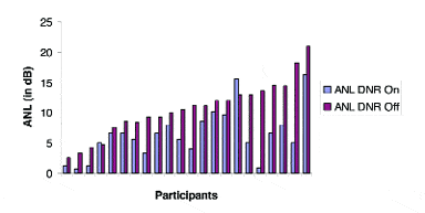 As can be observed from Figure 2, the DNR processing improved the ANL for 20 of the 22 subjects. Moreover, in general, the greatest benefit was for the individuals who had the largest ANLs with DNR-off (eg, the people who needed the most help). In fact, if we use the 10 dB cut-off mentioned by Nabelek for predicting hearing instrument success, only 45% of the subjects had ANLs of 10 dB or less for the DNR-off condition, whereas 86% of subjects met this ANL criterion with DNR-on.