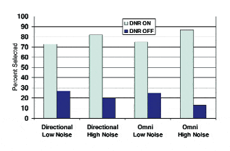 FIGURE 3. The study concerning wearer preference for DNR by Ricketts and Hornsby13 looked at paired-comparisons of 14 hearing-impaired subjects for directional and omni-directional modes in both low-noise condition (71 dBA/+6 SNR) and high-noise (75 dBA/+1 SNR) environments. For all four listening conditions there is a distinct preference for DNR-on.