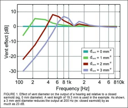 Vent diameter and length. The vent effect is controlled by the physical dimensions of the vent. It has been shown that the diameter of the vent and the length of the vent are two important parameters that affect the vent effect.2 Figure 1 shows that, as the vent diameter increases, the output in the low frequencies decreases and the frequency at the vent-associated resonance increases. The dip at 1.2 kHz is the first resonance of the receiver tubing system.