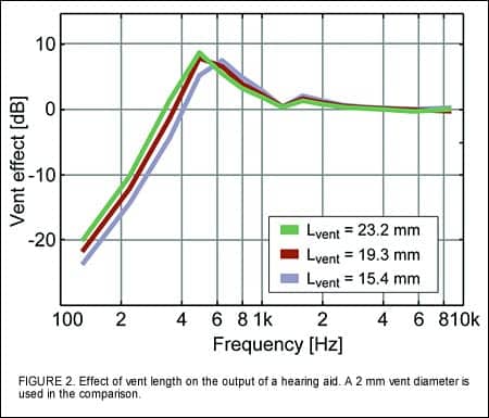 Figure 2 shows the effect of vent length on the vent effect using a vent diameter of 2 mm. As the vent length increases, the amount of low frequency output reduction decreases (eg, less effect) and the frequency of the vent-associated resonance decreases.