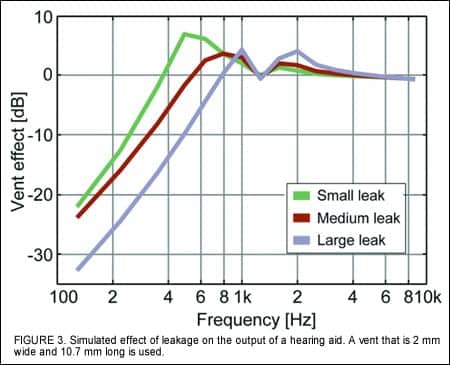 Leakage. Other factors may also affect the magnitude of the vent effect. For example, leakage between the hearing aid and the ear-canal wall (unintentional venting) is one such factor. Figure 3 shows the simulated output from a 10.7 mm long earmold with a 2 mm vent diameter as different amounts of leakage are introduced. The diameters of the leaks are 0.05 mm (small), 0.2 mm (medium), and 0.5 mm (large). When these leaks are added to the 2 mm vent, the resulting cross-sectional areas correspond to equivalent vent diameters of 2.2 mm, 2.6 mm, and 3.3 mm respectively. The small leak does not alter the vent effect of the 2 mm vent significantly while the large one does. This is because the equivalent size of the small leak is much smaller than that of the vent diameter. The change in slope of the medium leak is due to the greater losses from the leak than from the vent.