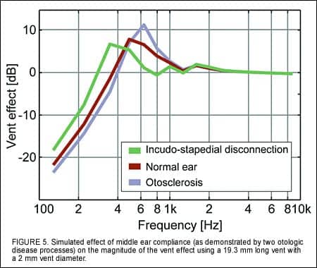 Middle ear compliance. The compliance (freedom of movement) of the middle ear also interacts with the vent dimensions to affect the vent effect. Figure 5 simulates and compares the vent effect of an ear with otosclerosis and an ear with ossicular discontinuity to that of a normal ear (using an earmold with a 2 mm vent diameter and 19.3 mm vent length). The ear with the otosclerosis has a less mobile middle ear and thus a lower compliance compared to a normal ear. The ear with discontinuity will have a hyper-mobile middle ear and thus a high compliance. Compared to an ear with normal compliance, an ear with a high compliance (discontinuity or a “loose” system) will have less vent effect (eg, less low frequency output reduction) and a lower vent-associated resonance. On the other hand, an ear with a low compliance (eg, “stiff” system) will have more low-frequency output reduction (eg, more vent effect) and a higher frequency at which the vent-associated resonance occurs. Furthermore, the magnitude of the vent associated resonance is also higher than the normal ear.