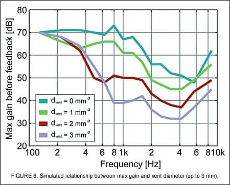 The direct relationship between the maximum in-situ gain before feedback and the acoustic characteristics of the hearing aid shell/earmold system led Widex engineers to develop a complex model that relates the maximum in-situ gain before feedback to the vent diameter, vent length, leakage, middle ear compliance, and residual volume of the wearer’s ear-canal. Using this model, the maximum in-situ gain can be predicted if one knows the magnitude of the overall vent effect. Conversely, if one knows the maximum in-situ gain of the hearing aid, one can predict the overall vent effect. Information on the overall vent effect can be used to compensate for the changes in the in-situ gain/output from the vent effect. This ensures that wearers receive a more consistent gain/output.