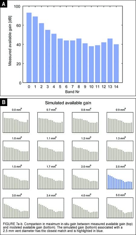 2. Estimation of overall vent effect. The maximum gain that is measured during the feedback test is used to estimate the overall vent effect experienced by the wearer and the hearing aid system. This is done by comparing the available gain measured after the feedback test to the modeled available gain for various modeled vent diameters. Figure 7 compares the measured in-situ gain (top) and the modeled gain (bottom) for various vent diameters with a length of 19.3 mm. The vent diameter associated with the modeled available gain (eg, closest in magnitude to the measured available in-situ gain across most frequencies) corresponds to the best estimate of the in-situ vent effect.