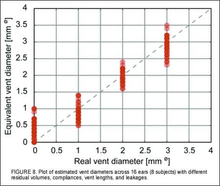 Figure 8 is a scatter-plot comparing the equivalent vent diameters to the nominal (or physical) vent diameters measured in 8 subjects (or 16 ears) with normal middle ears. Data points that fall on the diagonal dotted line would suggest perfect matches. One can see that the match between the estimated vent diameters and the nominal vent diameters is excellent (within 0.5 mm). Differences that are noted probably reflect the effect of the residual volume, vent length, leakage, and middle ear compliance on the prediction. When these effects are considered in isolation, vents that are used in small ears (or small residual volume) will have estimated diameters that are larger than the nominal values; while larger ears (or large residual volume) have estimated vent diameters that are smaller than the nominal values. Likewise, a longer-than-average vent length would yield a smaller estimated vent diameter than a shorter vent length.