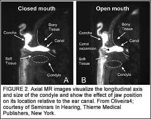 Axial Magnetic Resonance images5 provided in Figure 2a-b demonstrate the longitudinal axis and size of the condyle, and show the effect of jaw position relative to the ear canal. The condyle of the mandible has been outlined to facilitate its identification, and the border between the cartilaginous and osseous regions has been outlined by a solid white line. Note the substantial width of the condyle and its close proximity to the anterior aspect of the ear canal with at least two-thirds of it being in front of the cartilaginous region of the canal. This clearly visualizes the opportunity for its significant influence on canal activity. With the opening of the mouth (Figure 2b), the condyle moves forward, pulls the cartilage in front of the ear canal, and expands the canal.