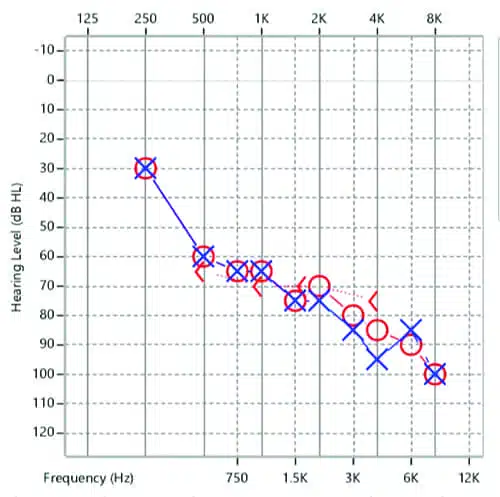 First, I have a bilateral symmetrical sensorineural hearing loss with ranges that can be referred to, more or less, as “mild” in the low frequencies (below 500 Hz), “moderately severe” in the lower mid frequencies (500 to 1000 Hz), “severe” in the upper mid frequencies (1500 to 3000 Hz), “profound” in the high frequencies (4000 to 6000 Hz), and, nowadays, unresponsive above 8000 Hz (Figure 1). These progressive ranges of hearing loss each present a unique set of requirements for optimal gain, equalization, and dynamic range modification. Therefore, a hearing aid with multiple channels of the stated characteristics seems an obvious ideal choice. So that’s what I use when I wear one hearing aid while performing on stage.