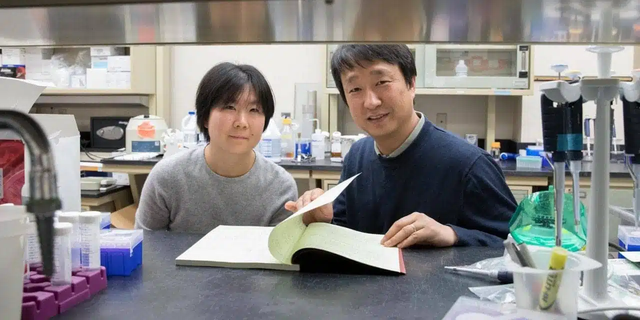 Postdoctoral researcher Ting-Ting Du, left, led the research in the lab of neuroscientist Jung-Bum Shin, right, that explores the role of the inner ear’s cuticular plate in hearing loss. (Photo by Dan Addison, University Communications)