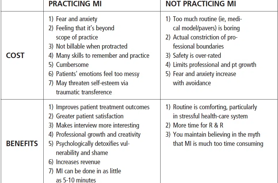 The MI decisional balance sheet is a visual tool that summaries the pros and cons of change. Figure 1 elucidates both sides of what may be some clinicians’ ambivalence about using motivational engagement tools.