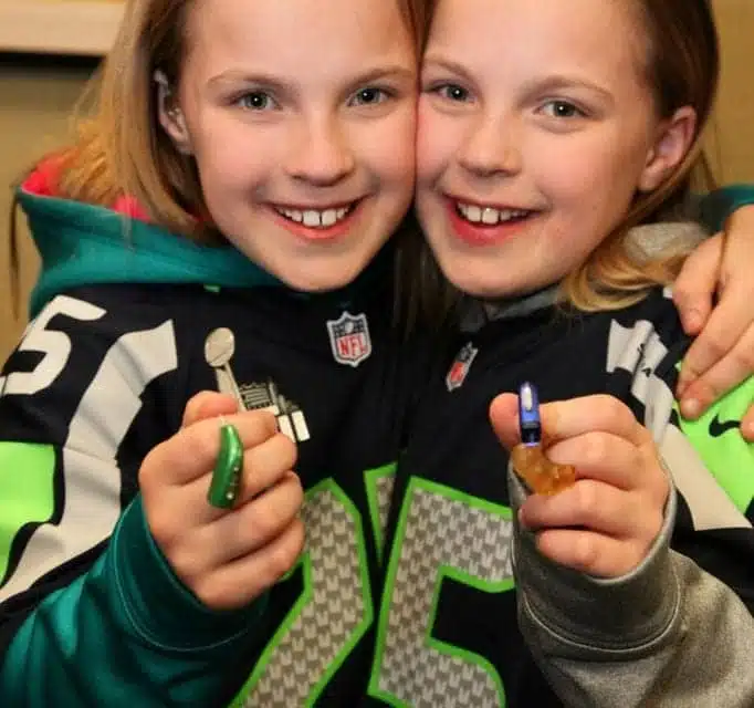 Riley and her twin sister Erin proudly donned their Seattle Seahawks blue-and-green Oticon Sensei to show their support for Derrick in media interviews and pre-game events leading up to the Super Bowl and at the Big Game itself.