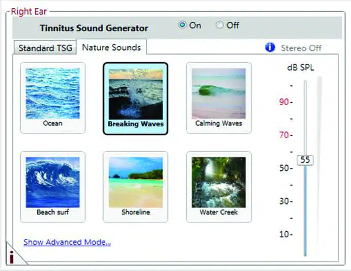 To expand the flexibility of our tinnitus sound generator (TSG), Nature Sounds options have been added as alternative sounds to the white noise generator in the ReSound Aventa® fitting software (Figure 1). Nature Sounds are synthesized versions of the natural water sounds. They were created by applying modulation extraction derived from recordings of actual water sound environments.