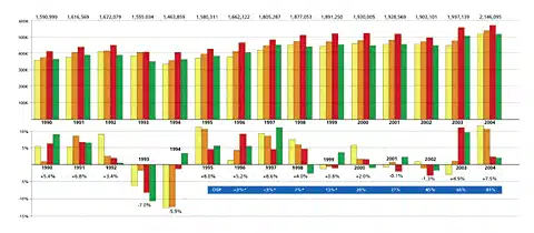 Figure 1. US hearing instrument quarterly and yearly unit sales (top), and percentage gains/losses relative to the previous year (bottom), 1990-2004. The blue bar on the bottom shows the corresponding market share of DSP aids for each year. Last year was the first in that it exceeded 2 million units and in which all four quarters saw sales exceeding 500,000 units. There now have been 7 successive quarters (July 2003 to present) of positive unit volume growth—a streak unrivaled since the 4-year period from January 1995 to September 1998. Source: Hearing Industries Assn (HIA) and HR.