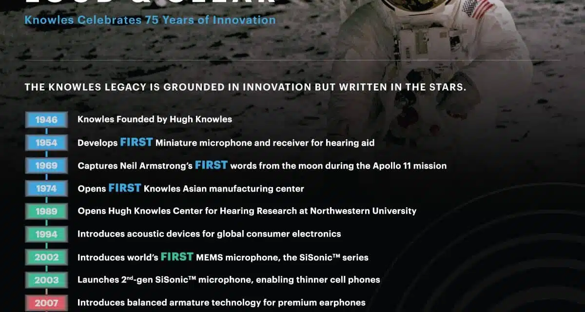 Knowles Corporation (NYSE: KN), a provider of advanced micro-acoustic microphones and speakers, audio solutions, high-performance capacitors, and RF products, announced that it is celebrating 75 years of “innovation and industry firsts that have redefined the audio experience for generations.”