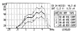 A simple coupler measurement may be useful to verify the effects of compression across the frequency range for a hearing aid. As shown in Figure 1a, the compression characteristics of a hearing aid were evaluated in a 2 cc coupler of a Frye 6500 analyzer for 50 dB, 65 dB, and 80 dB inputs. Note the gain of the hearing aid adaptively decreased as the input changed from 50 dB to 65 dB to 80 dB. Figure 1b shows the ineffectiveness of compression in another hearing aid where gain remained the same regardless of input level.