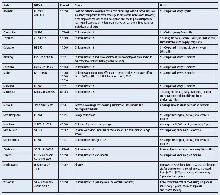 The above chart shows 18 states have enacted hearing aid insurance coverage legislation. Only two include adults and many have limitations, such as only for newborns, or for children under 12, or 15, or 18. What happens when you reach the age limit? Do you just stop needing to hear? Actually getting these laws passed took a huge effort on the part of consumer and professional advocates who often formed coalitions in the states to make it happen.