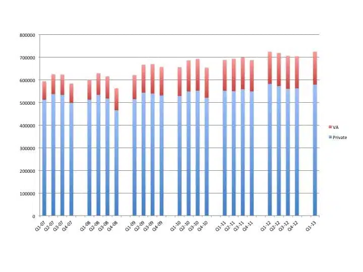 Quarterly net unit volume sales of hearing aids, 2007-2013. Unit sales in the first quarter were essentially the same (725 more units) than during the first quarter of 2012. Red represents VA units; blue represents private-sector unit sales. |