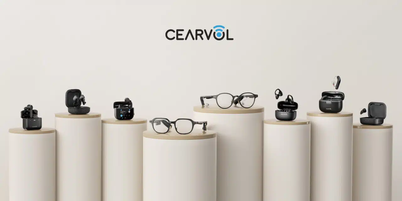 Featured image: Cearvol products shown at CES 2026, including the Cearvol Liberte open-ear hearing aid, Cearvol Lyra smart hearing glasses, and the Cearvol Wave hearing aid featuring a touchscreen charging case. Photo: Cearvol