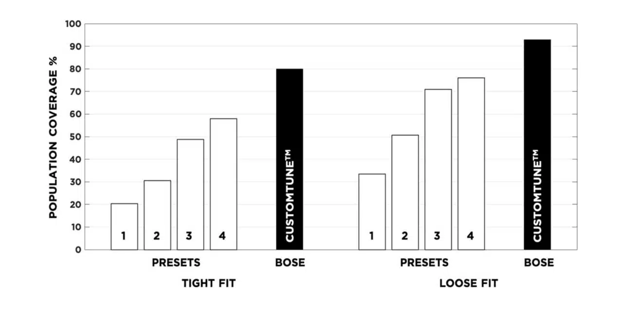 Overall, these data show that Bose CustomTune can cover substantially more of the population of individuals with mild-to-moderate hearing loss than a device with 1-4 presets. Goman and Lin7 estimated there are 36.4 million individuals in the United States with mild-to-moderate hearing loss. Given this figure, the increased coverage could mean that 6.2-8 million more individuals could satisfy the “fit” criterion with Bose CustomTune than a device with 1-4 presets.