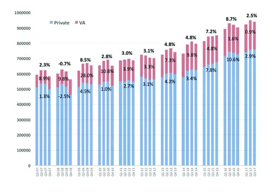 Hearing aid unit sales in the United States remained relatively flat in the third quarter (Q3) of 2017, compared with the last four years, but still within historical growth norms, according to statistics generated by the Hearing Industries Association (HIA), Washington, DC. In the third quarter of 2017, private sector unit sales of hearing aids increased by 2.8%, VA dispensing fell by 1.3%, and the total market gained 2.0% in unit volume compared to the same period last year.