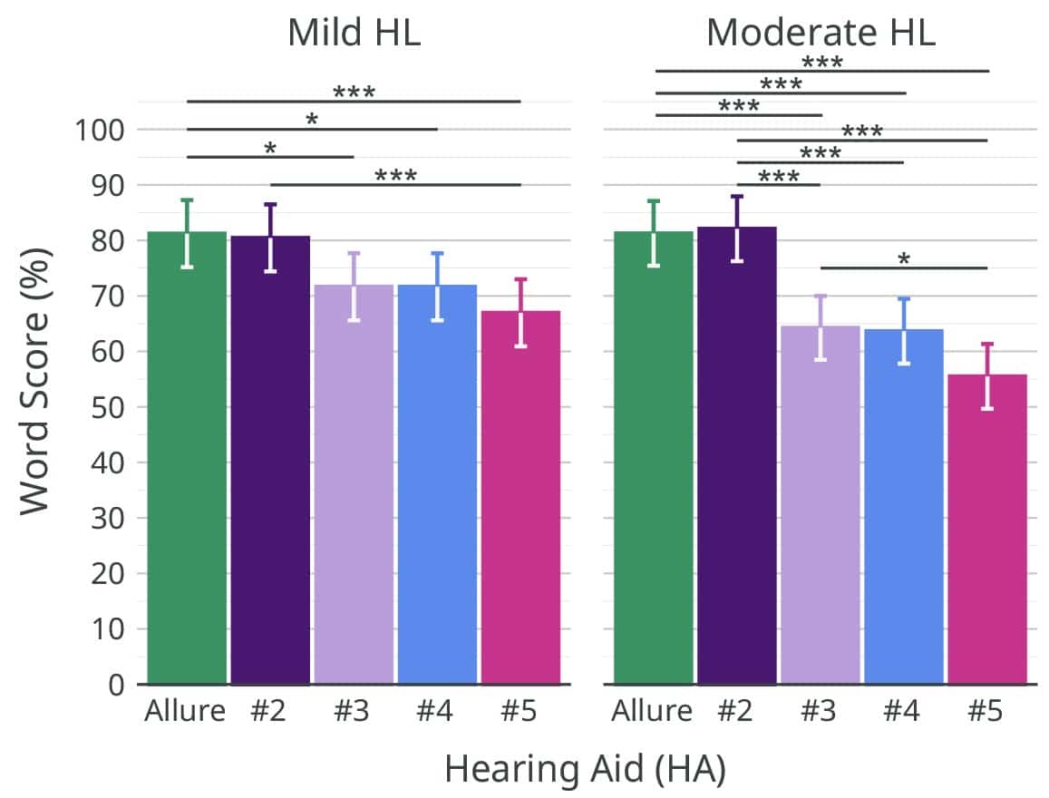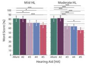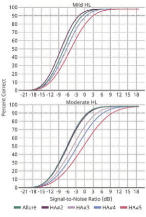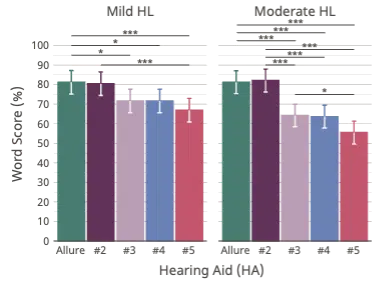 Listeners with a milder hearing loss typically have fewer auditory‑resolution challenges than those with more hearing losses. Thus, we would expect poorer aided performance in the moderate than in the mild hearing loss group. However, word‑recognition scores for Allure and HA#2 were similar across mild and moderate groups (about 80%). In contrast, HA#3–HA#5 showed poorer performance in the moderate than in the mild group (60% vs. 70%). This suggests that Allure and HA#2 likely offer even more benefit to those with a moderate loss than the other study devices.