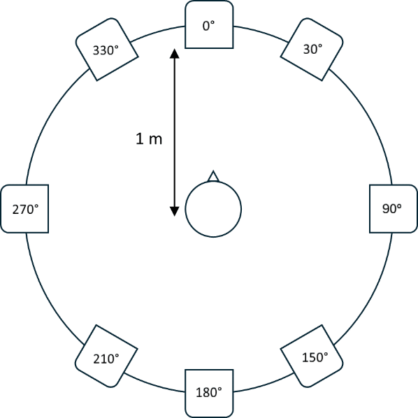 Hearing aid fitting and testing took place inside a sound-treated booth (3 x 3 x 2 m; W x L x H). Listeners were surrounded by eight loudspeakers as shown in Figure 1. The target speech was presented from -30°, 0°, or +30° azimuth in a pseudo-random order simulating a group conversation. Every second sentence came from 0°, while the side‑speaker location (±30°) was randomized with an equal number of presentations. The level of the speech was initially 83 dB SPL and thereafter adjusted based on listener performance. Three speech-like temporally decorrelated distractor signals (ISTS, Holube et al., 2010) were presented from 150°, 180°, and 210°. Additionally, cafeteria noise was presented from 90°, 150°, 180°, 210°, and 270° at -10 dB relative to the ISTS signal. The total combined background noise level was 68 dB SPL.