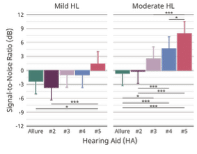 Differences across hearing aids at SRT90 were more evident in the Mod HL group compared to the Mild HL group (Figure 3). Notably, in the Mod HL Group, Allure and HA#2 did not differ significantly from one another. Allure outperformed all other hearing aids except HA#2 by an average of 5.2 to 8.5 dB in this study. In the Mild HL group, Allure and HA#2 did not differ from each other. Allure significantly outperformed HA#5 by 3.6 dB.