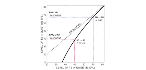 Loudness is the magnitude of auditory sensation [1]. Typically, when we increase the sound pressure level (SPL) of a sound in quiet, listeners report that the sound becomes louder, and when we reduce its level, listeners report that the sound becomes softer. On the other hand, in the presence of a noisy background, the loudness of a target sound (TS) depends not only on the SPL of the TS itself, but also on the levels of the other sounds in the listening environment [2]. Consider someone speaking at a conversational level of 65 dB SPL in a quiet room. This would be perceived as “natural,” “comfortably loud,” and “clearly audible” by most listeners with normal hearing. However, if the same talker was speaking at the same SPL in a noisy room, the listener could perceive them as speaking too softly. For speech to be perceived as equally loud in the noisy room as it does in the quiet room, the talker would have to speak more loudly.