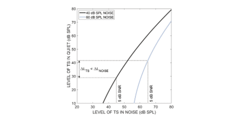The phenomenon by which the loudness of a TS is reduced by the presence of other sounds is called partial loudness, and it can be described by a masked loudness-matching function such as that shown in Figure 1. The black line shows the level of the TS alone (in quiet) as a function of the level of the TS in noise at the point where the loudness of both would be considered equal. The exact shape of the function is unique to each TS and masking noise type and level. Typically, the masked loudness-matching function shows that the level of the TS needs to be higher in noise than in quiet to achieve equal loudness (see Figure 1 legend for illustration).