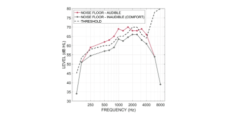 To provide the full dynamic range of an input sound to the hearing aid wearer, the range of output from the hearing aid should be placed such that sounds from the softest to the loudest are audible at all frequencies. The bottom or the lower end of the output range is referred to as the aided noise floor. If the aided noise floor is placed above the hearing threshold level of the listener, even the softest sounds should be audible (Figure 4, red curve). On the other hand, in the presence of background noise, we may reduce the audibility of the noise by placing the aided noise floor below the hearing aid wearer’s threshold (Figure 4, gray curve). By placing the noise floor just below the hearing threshold and speech just above the hearing threshold, we could ensure audibility of the TS while lessening the impact of noise to result in a louder perception of the TS.
