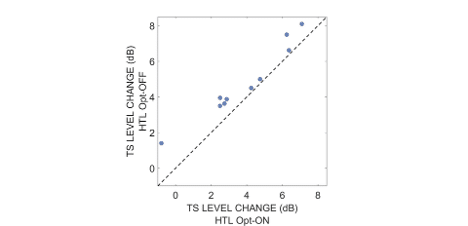 These results show that the same TS level is generally perceived as louder in the HTL Opt-ON condition than in the HTL Opt-OFF condition. Thus, the action of the HTL Opt improves the “perceptual” SNR by increasing the contrast between the auditory foreground (i.e., TS) and the background (i.e., noise), making it easier for listeners to group speech features into coherent auditory objects and put them into meaningful streams of information. Anecdotally, some of our research participants reported that speech “pops out” from the noise background with HTL Opt activated.