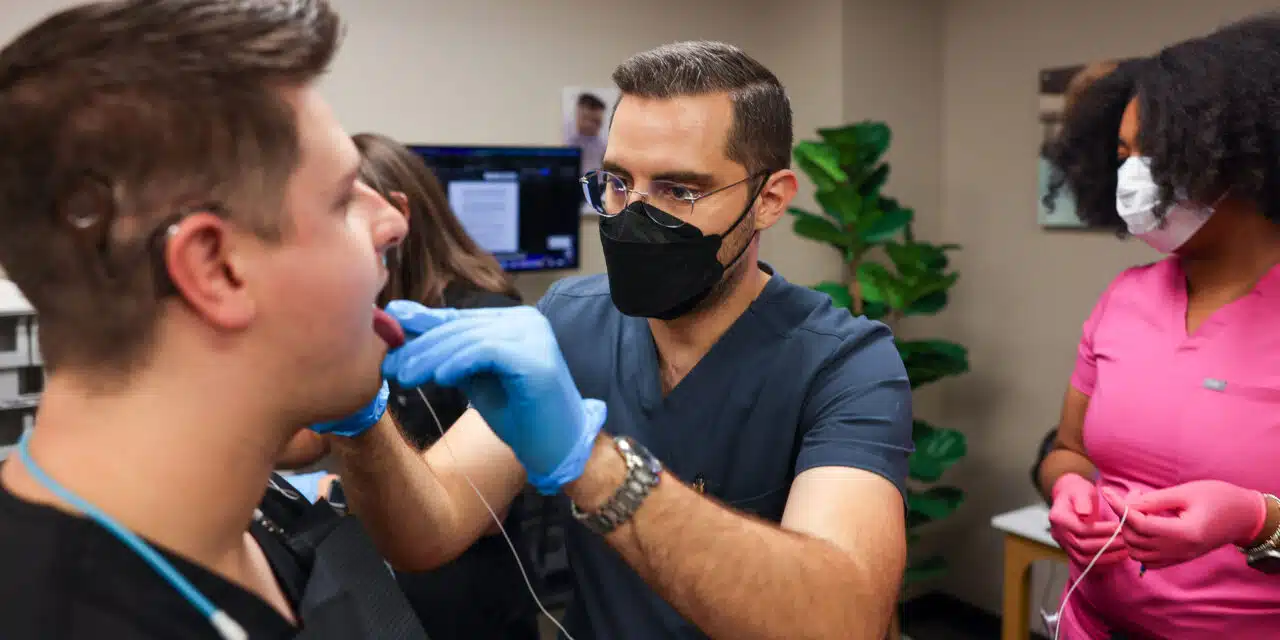 Featured image: University of Oklahoma College of Allied Health researcher Matthew Masapollo, PhD, attaches copper electrodes on the face of Brenner McDougal, a student in the doctor of audiology program who has a cochlear implant. Photo: University of Oklahoma College of Allied Health