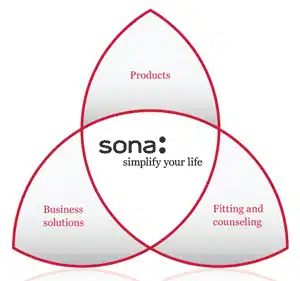 The goal of sona is to provide innovative business solutions and unique services, with the best technology available. Our products are developed from within the Sonova Group and offer outstanding features. But we really don’t want to fight the hearing aid feature war. We certainly offer advanced products, but our real strength is in providing unique integrated solutions ideally suited for first-time users. These involve products, an advanced fitting and counseling approach, and business solutions that help grow a practice.