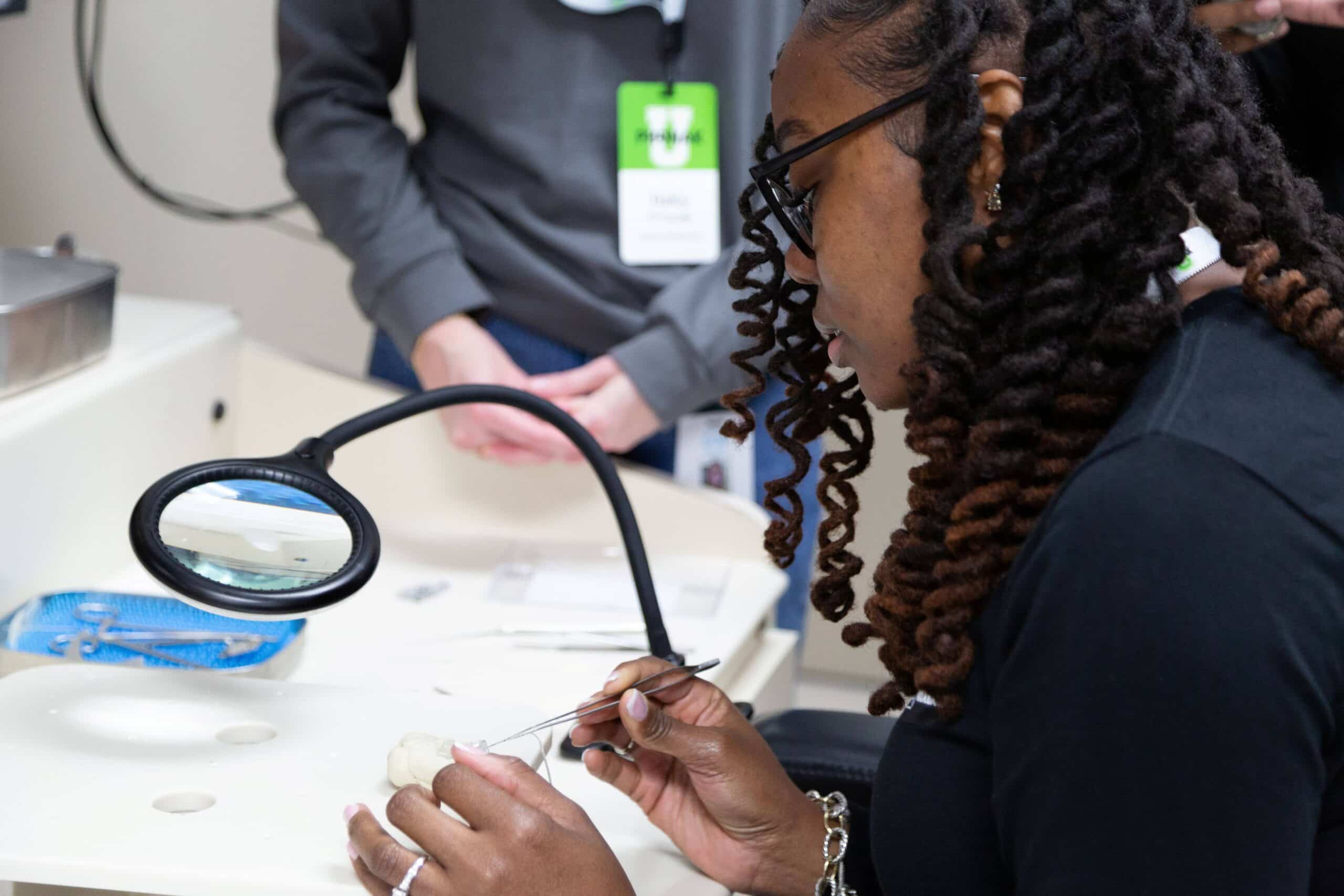 “This year, it’s a much deeper dive into the technology of cochlear implants and hearing aid fittings,” explains Brandy Pouliot, director of audiology and education at Sonova, whose team planned the event. “So we thought third and fourth years are at a really great time in their academic education for this. They’re seeing patients, they’re getting ready for their externship, so they’re like, ‘All right, I need like a little bit more.’”