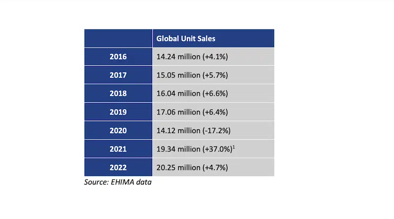 1. The global unit sales for the year 2021 were slightly adjusted upon review of EHIMA’s internal reporting standards.