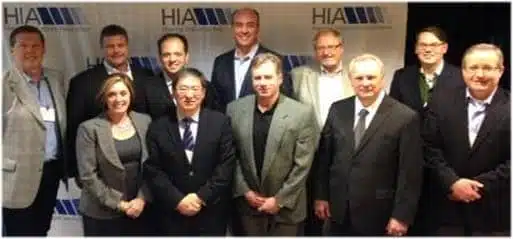 HIA Board Members include Jeff Newnham (Phonak), Rodney Schutt (Widex), Gordon Walker (Knowles Electronics), Todd Murray (GN ReSound), Peer Lauritsen (Oticon), Scott Davis (Siemens); Front Row L-R: Carole Rogin (HIA president), Robert Tong (ON Semiconductor), Jeff Taylor (Sonion), Jerry Ruzicka (Starkey), and Kevin Kouba (Rayovac).