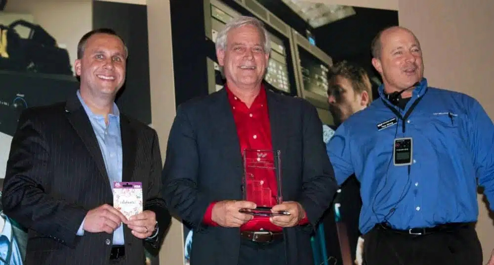 Williams Sound VP of sales Tony Braun and National Sales Manager Tony Strong present “Rep of the Year” award to Michael Canning (center), principal of Cadon Technical Sales. Photo courtesy: Williams Sound