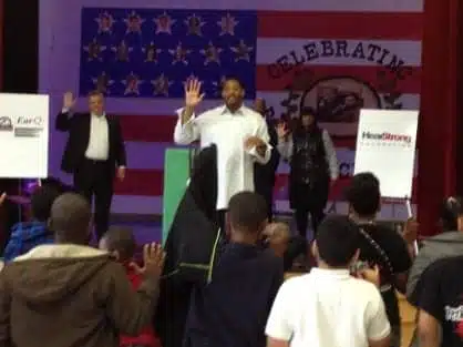 | Robert Horry addresses the Houston school children. |