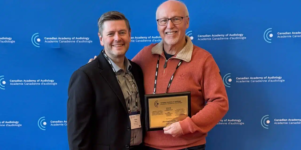 Featured image: Steve Aiken, PhD, presented the Richard Seewald Career Award from the Canadian Academy of Audiology to Marshall Chasin, AuD, right.