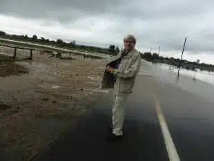 | Garry Gordon of E.A.R. Inc in front of a flooded-over  road near Boulder. (Garry’s arm is in a splint due to a previous accident unrelated to the flooding.)  |