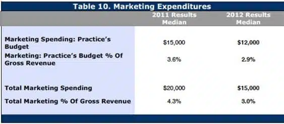Table 2. Marketing expenditures for 2011 and 2012. The median hearing practice spent 3% of its gross practice revenue for marketing or a median of $15,000.