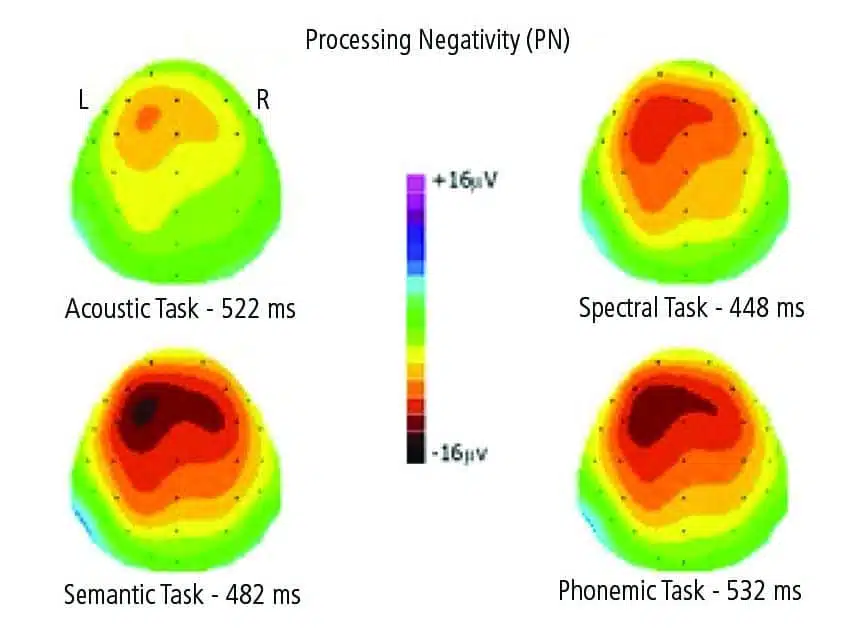 2) In the case of non-targets (high probability), a processing negativity (PN) component3 in the latency range from 300-1200 msec, depending on the stimuli used. In the case of CVCs, the PN can be observed as a negativity peaking in the 450-550 msec range and slowly returning to baseline. The degree of negativity increases with the difficulty of the listening task (not to be confused with the familiar N400 response4 to semantic incongruity, or the late negativity(LAN)5 identified with syntactic processing). All three share the same post-stimulus latency range.