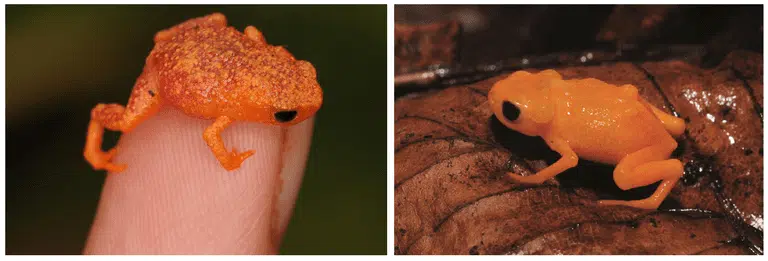 Photographs of “pumpkin toadlets.” Left: adult Brachycephalus pitanga on a fingertip, Right: adult Brachycephalus ephippium. Courtesy of Dr Sandra Goutte.