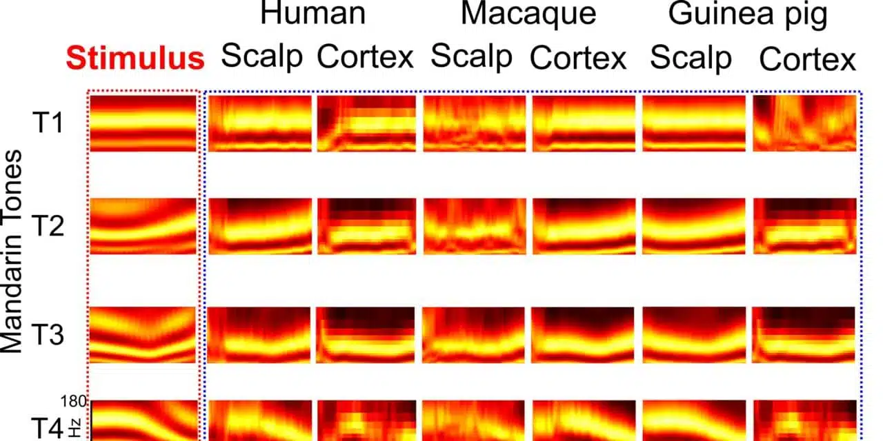 In response to four different tones of the Mandarin syllable “yi,” the brains of English-speaking individuals who aren’t familiar with Mandarin Chinese generated similar FFRs as macaque monkeys and guinea pigs, both of which have very similar hearing range and sensitivity to humans.