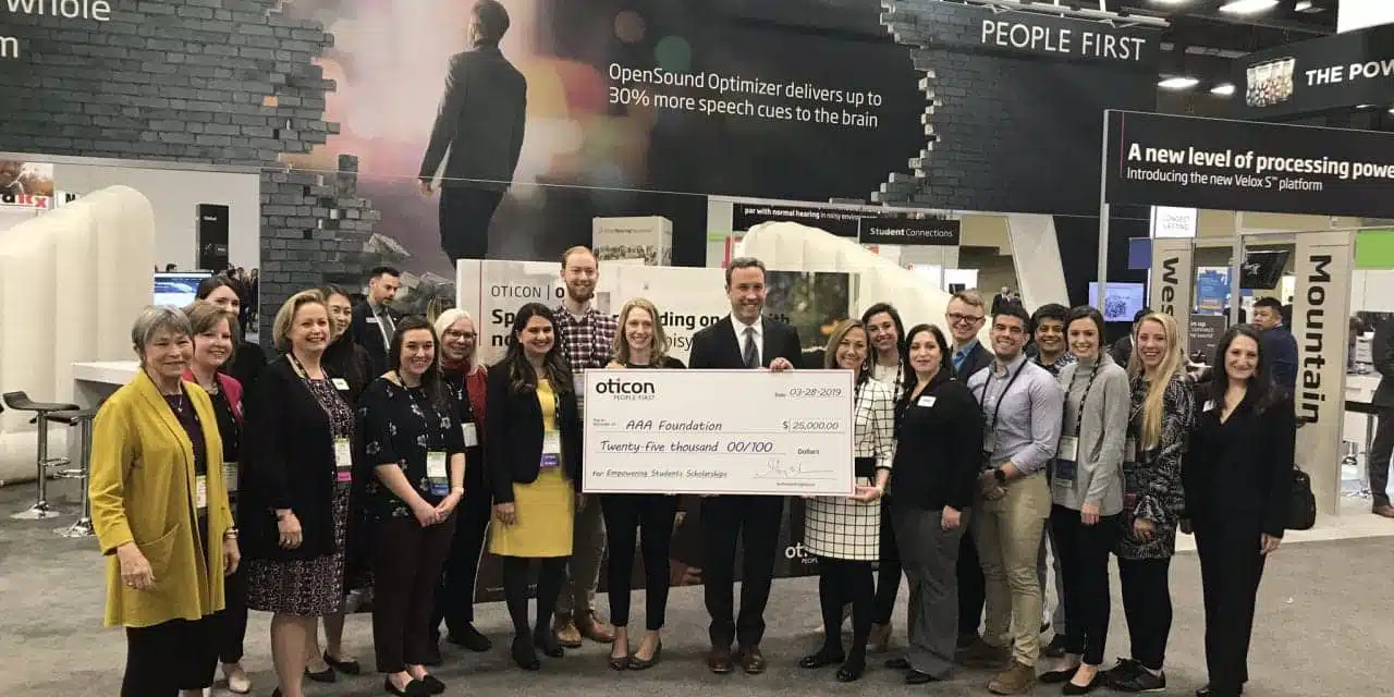 At the 2019 American Academy of Audiology Conference, Oticon President Gary Rosenblum presented American Academy of Audiology Foundation trustees with a $25,000 donation to the Foundation’s Empowering Students Scholarship Fund.