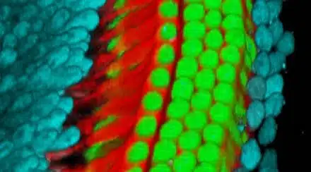 A microscopic view of cells within the ear of a newborn mouse showing in red and blue the supporting cells that surround the hair cells (green) that send sound signals to the brain. New research shows that the supporting cells can regenerate if damaged in the first days of life, allowing hearing to develop normally, which gives new clues for potential ways to restore hearing. Image credit: Guoqiang Wan, U-M.