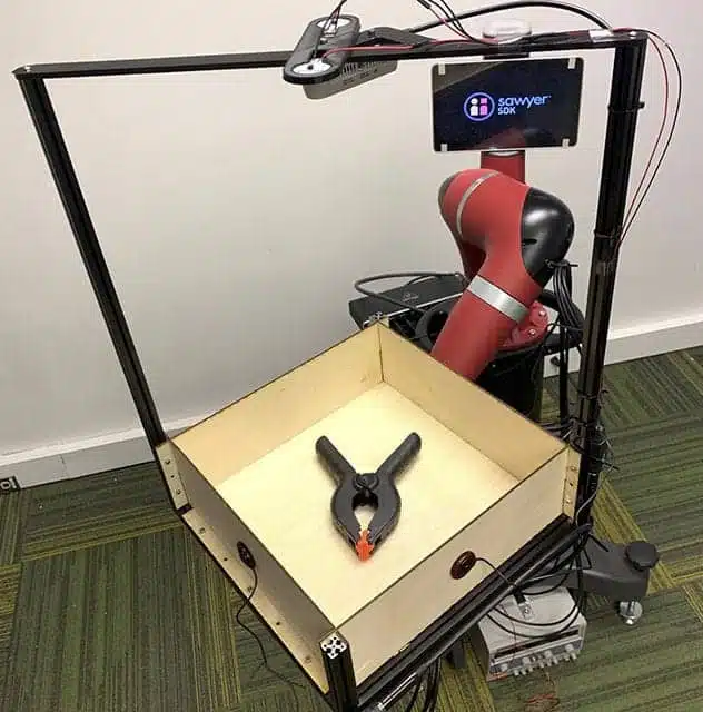 The team captured these interactions using an experimental apparatus they called Tilt-Bot—a square tray attached to the arm of a Sawyer robot. It was an efficient way to build a large dataset; they could place an object in the tray and let Sawyer spend a few hours moving the tray in random directions with varying levels of tilt as cameras and microphones recorded each action.