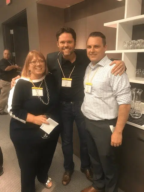 Justin Osmond of The Olive Osmond Foundation (center) takes a moment at the AUDNET Hearing Group Expo to visit with Deb Grant of AUDNET Hearing Group and Dr Lance Nelson of West Coast Hearing and Balance.